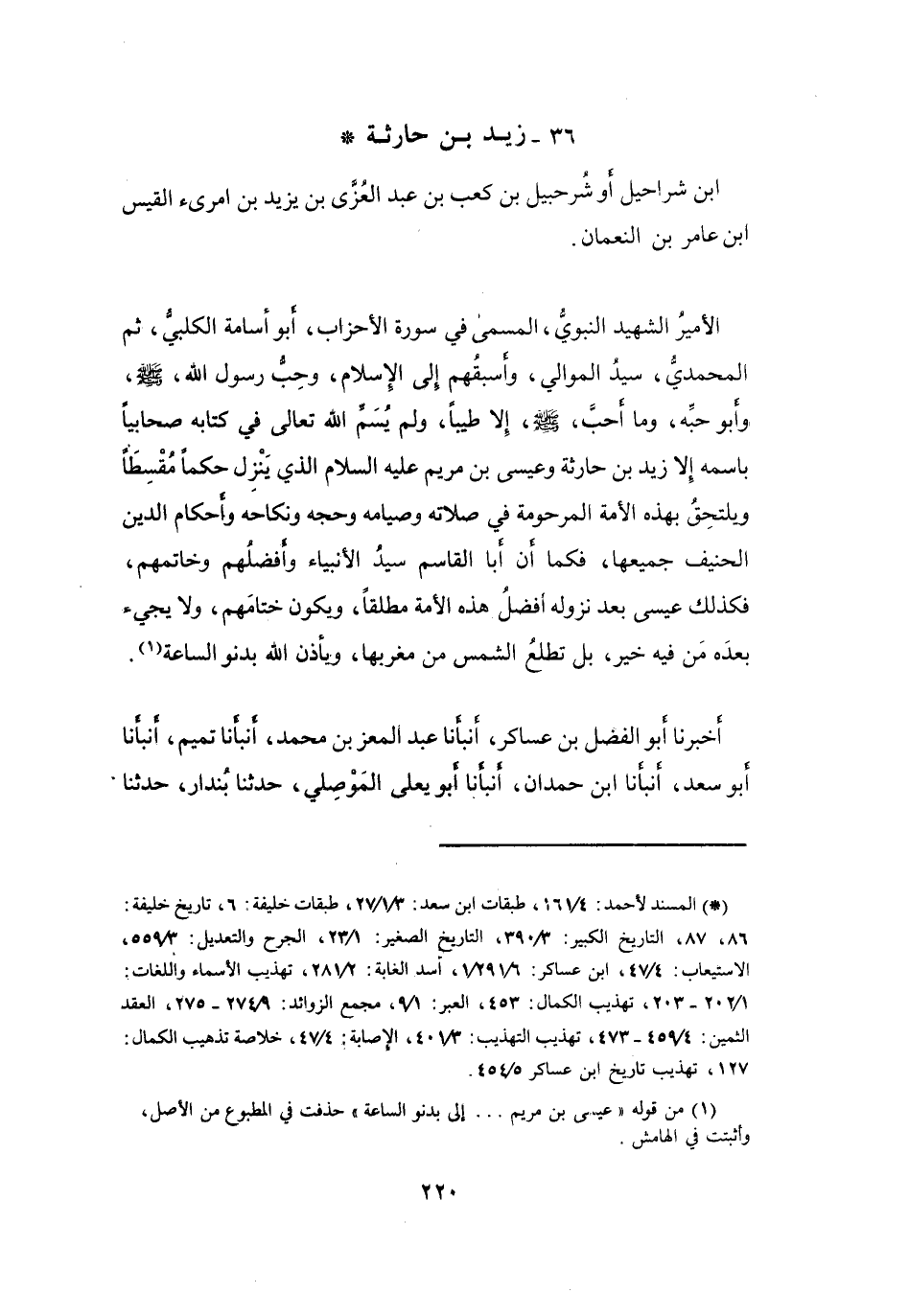 وَلَمْ يُسَمِّ اللهُ -تَعَالَى- فِي كِتَابِهِ صَحَابِيّاً بِاسْمِهِ إِلاَّ زَيْدَ بنَ حَارِثَةَ، وَعِيْسَى بنَ مَرْيَمَ -عَلَيْهِ السَّلاَمُ- الَّذِي يَنْزِلُ حَكَماً مُقْسِطاً، وَيَلْتَحِقُ بِهَذِهِ الأُمَّةِ المَرْحُوْمَةِ فِي صَلاَتِهِ وَصِيَامِهِ وَحَجِّهِ وَنِكَاحِهِ وَأَحْكَامِ الدِّيْنِ الحَنِيْفِ جَمِيْعِهَا، فَكَمَا أَنَّ أَبَا القَاسِمِ سَيِّدُ الأَنْبِيَاءِ وَأَفْضَلُهُم وَخَاتَمُهُم، فَكَذَلِكَ عِيْسَى بَعْدَ نُزُوْلِهِ أَفْضَلُ هَذِهِ الأُمَّةِ مُطْلَقاً، وَيَكُوْنُ خِتَامَهُم، وَلاَ يَجِيْءُ بَعْدَهُ مَنْ فِيْهِ خَيْرٌ، بَلْ تَطْلُعُ الشَّمْسُ مِنْ مَغْرِبِهَا، وَيَأَذْنُ اللهُ بِدُنُوِّ السَّاعَةِ (1) .