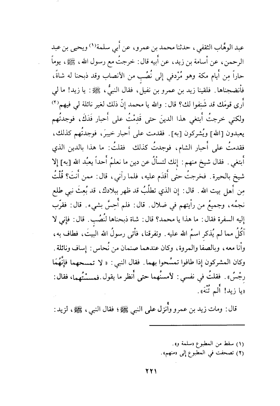 خَرَجْتُ مَعَ رَسُوْلِ اللهِ -صَلَّى اللَّهُ عَلَيْهِ وَسَلَّمَ- يَوْماً حَارّاً مِنْ أَيَّامِ مَكَّةَ، وَهُوَ مُرْدِفِي إِلَى نُصُبٍ مِنَ الأَنْصَابِ، وَقَدْ ذَبَحْنَا لَهُ شَاةً، فَأَنْضَجْنَاهَا، فَلَقِيَنَا زَيْدُ بنُ عَمْرِو بنِ نُفَيْلٍ.
