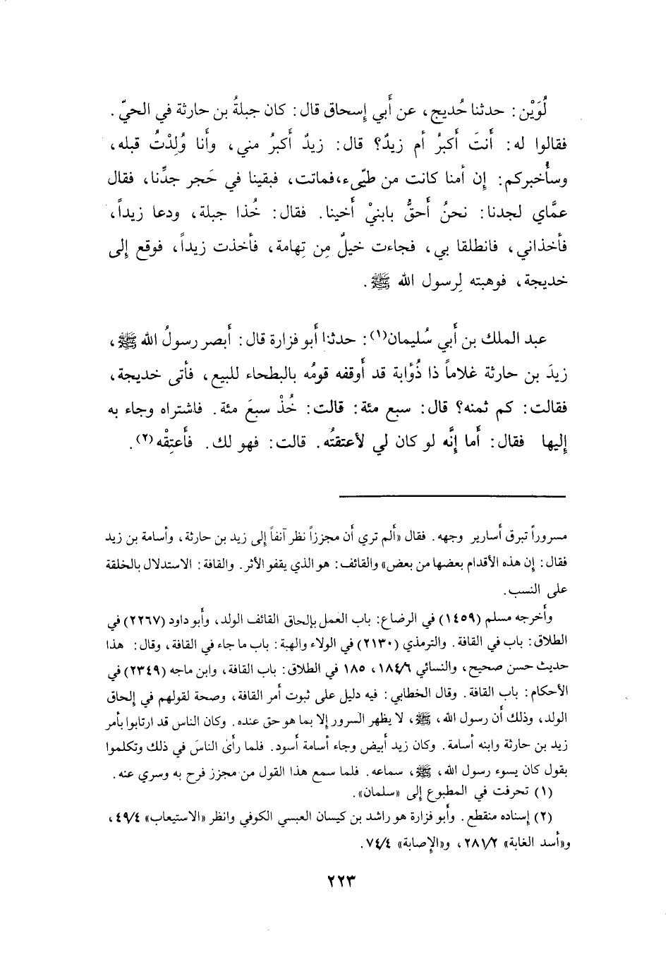 فقال " ألم تري أن مجززا نظر آنفا إلى زيد بن حارثة، وأسامة بن زيد فقال: إن هذه الاقدام بعضها من بعض " والقائف: هو الذي يقفو الاثر.