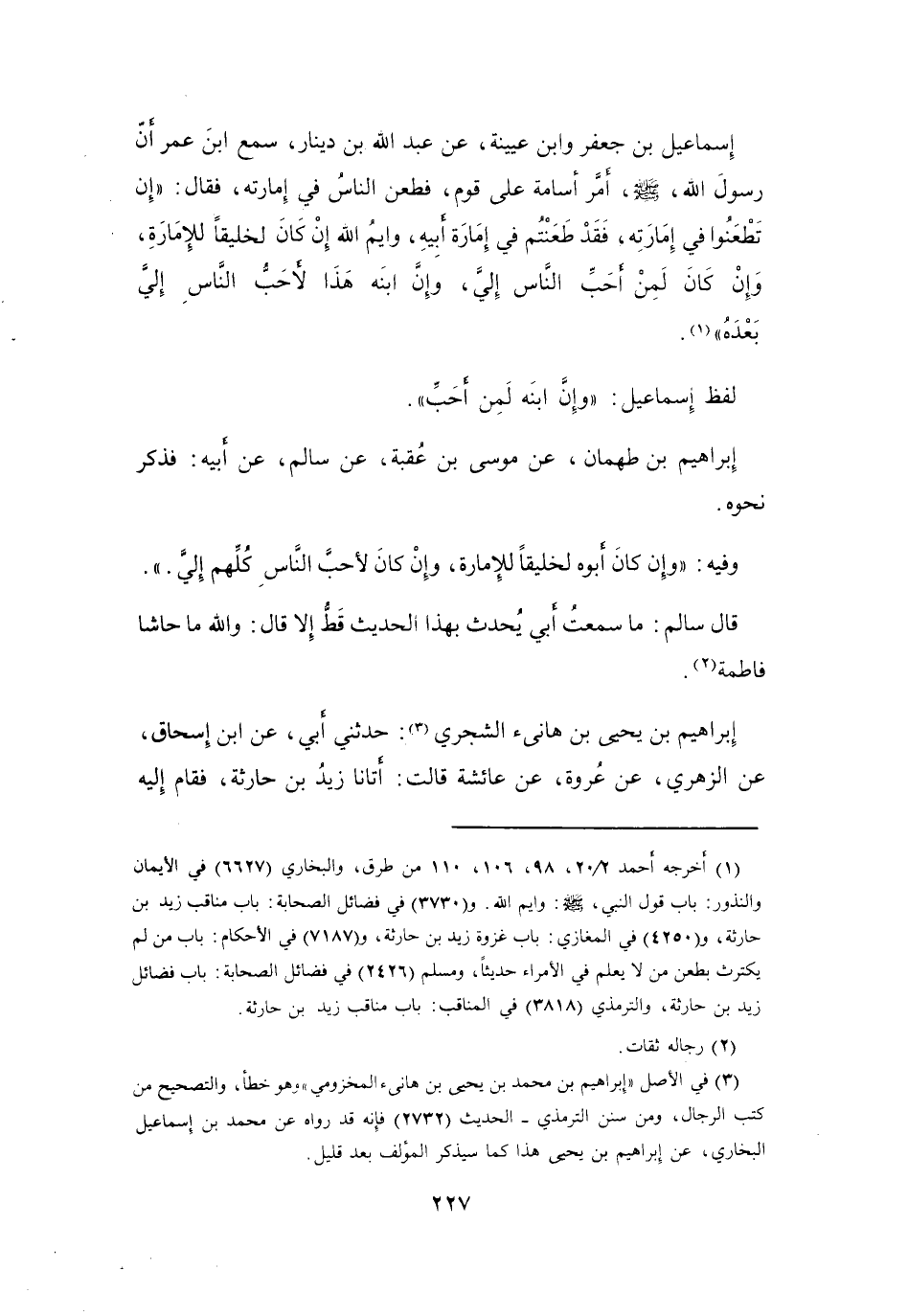 و (3730) في فضائل الصحابة: باب مناقب زيد بن حارثة، و (4250) في المغازي: باب غزوة زيد بن حارثة، و (7178) في الاحكام: باب من لم يكترث بطعن من لا يعلم في الامراء حديثا، ومسلم (2426) في فضائل الصحابة.