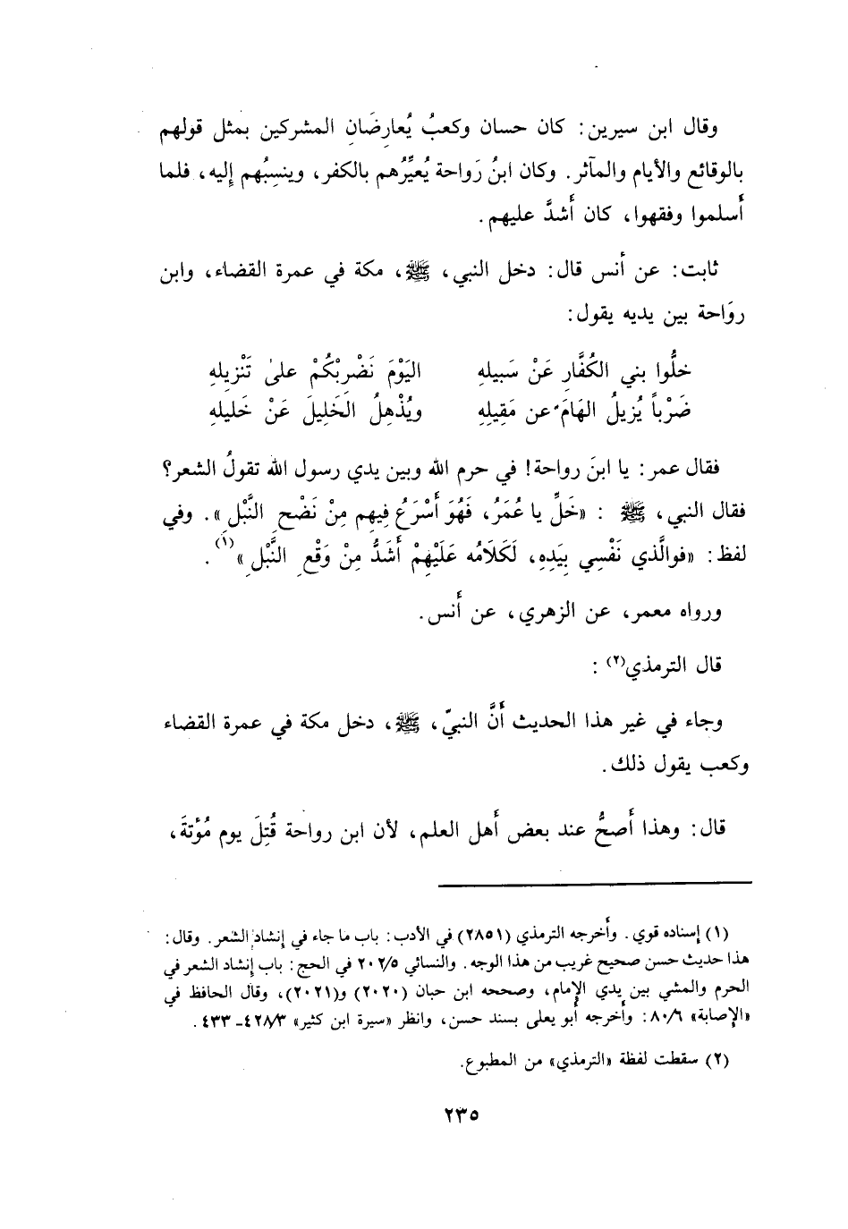 والنسائي 5 / 202 في الحج: باب إنشاد الشعر في الحرم والمشي بين يدي الامام، وصححه ابن حبان (2020) و (2021) ، وقال الحافظ في " الإصابة " 6 / 80: وأخرجه أبو يعلى بسند حسن، وانظر " سيرة ابن كثير " 3 / 428 - 433.