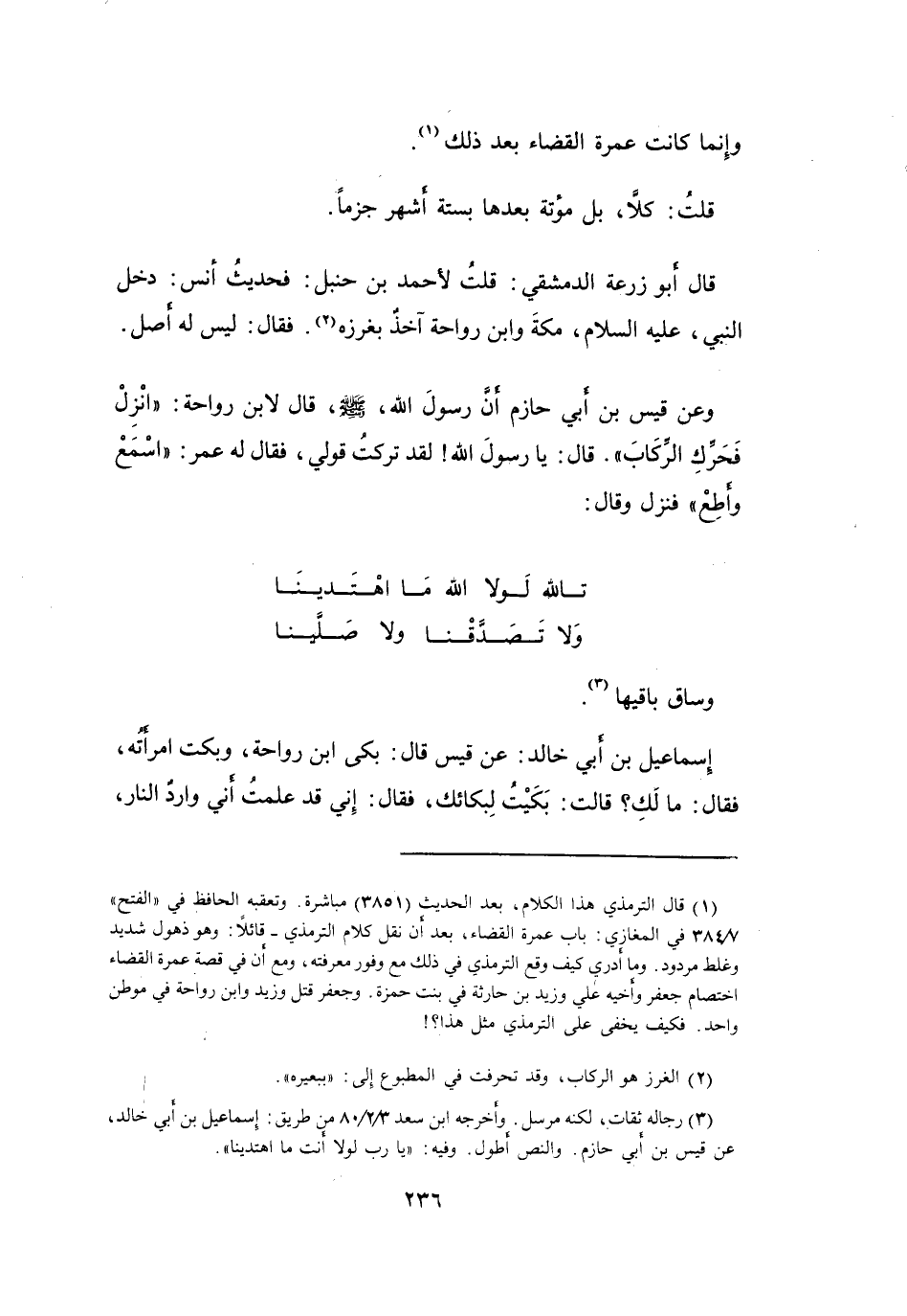 وتعقبه الحافظ في " الفتح " 7 / 384 في المغازي: باب عمرة القضاء، بعد أن نقل كلام الترمذي - قائلا: وهو ذهول شديد وغلط مردود.