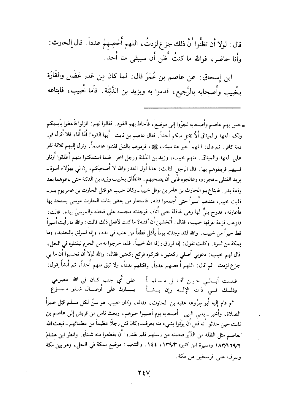 ثم قال: اللهم أحصهم عددا، واقتلهم بددا، ولا تبق منهم أحدا، ثم أنشأ يقول: فلست أبالي حين أقتل مسلما * على أي جنب كان في الله مصرعي وذلك في ذات الاله وإن يشأ * يبارك على أوصال شلو ممزع ثم قام إليه أبو سروعة عقبة بن الحارث، فقتله، وكان خبيب هو سن لكل مسلم قتل صبرا الصلاة، وأخبر - يعني النبي - أصحابه يوم أصيبوا خبرهم، وبعث ناس من قريش إلى عاصم بن ثابت حين حدثوا أنه قتل أن يؤتوا بشيء منه يعرف - وكان قتل رجلا عظيما من عظمائهم - فبعث الله لعاصم مثل الظلة من الدبر فحمته من رسلهم فلم يقدروا أن يقطعوا منه شيئا ".