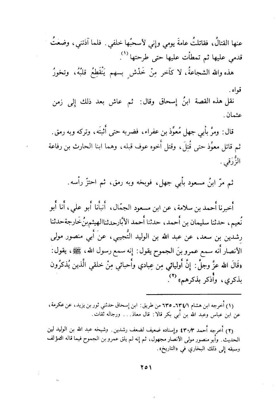قَالَ: وَمرَّ بِأَبِي جَهْلٍ مُعَوِّذُ بنُ عَفْرَاءَ، فَضَرَبَهُ حَتَّى أَثْبَتَهُ، وَتَرَكَهُ وَبِهِ رَمَقٌ.