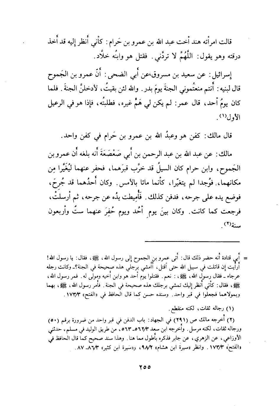 (2) أخرجه مالك ص (291) في الجهاد: باب الدفن في قبر واحد من ضرورة برقم (50) ورجاله ثقات، لكنه مرسل.