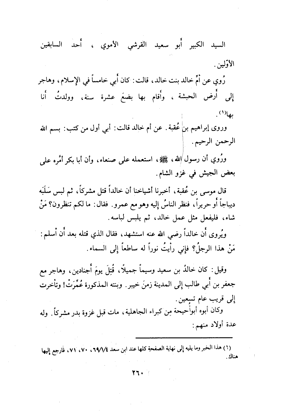وَقِيْلَ: كَانَ خَالدُ بنُ سَعِيْدٍ وَسِيْماً، جَمِيْلاً، قُتِلَ يَوْمَ أَجْنَادِيْنَ، وَهَاجَرَ مَعَ جَعْفَرِ بنِ أَبِي طَالِبٍ إِلَى المَدِيْنَةِ زَمَنَ خَيْبَرَ، وَبِنْتُهُ المَذْكُوْرَةُ عُمِّرَتْ، وَتَأَخَّرَتْ إِلَى قَرِيْبِ عَامِ تِسْعِيْنَ.
