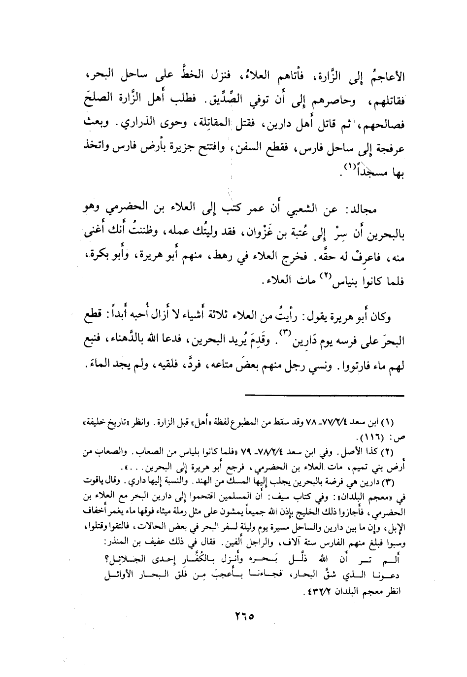 وقال ياقوت في " معجم البلدان ": وفي كتاب سيف: أن المسلمين اقتحموا إلى دارين البحر مع العلاء بن الحضرمي، فأجازوا ذلك الخليج بإذن الله جميعا يمشون على مثل رملة ميثاء فوقها ماء يغمر أخفاف الابل، وإن ما بين دارين والساحل مسيرة يوم وليلة لسفر البحر في بعض الحالات، فالتقوا وقتلوا، وسبوا فبلغ منهم الفارس ستة آلاف، والراجل ألفين.