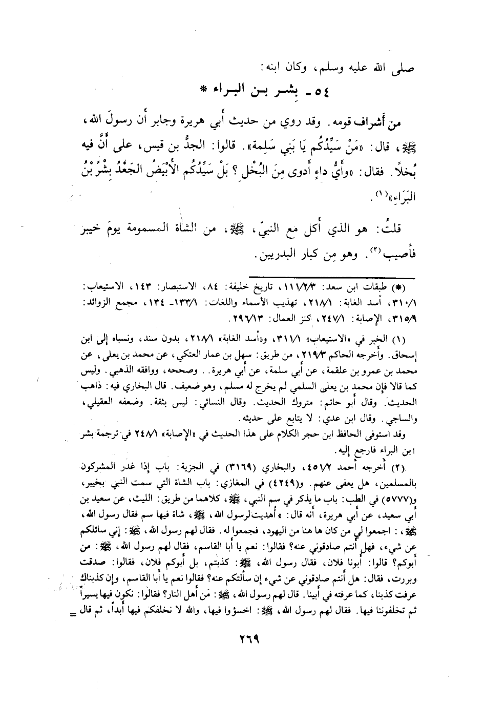 فَقَالَ: (وَأَيُّ دَاءٍ أَدْوَى مِنَ البُخْلِ؟ بَلْ سَيِّدُكُم الأَبْيَضُ الجَعْدُ: بِشْرُ بنُ البَرَاءِ (1)) .