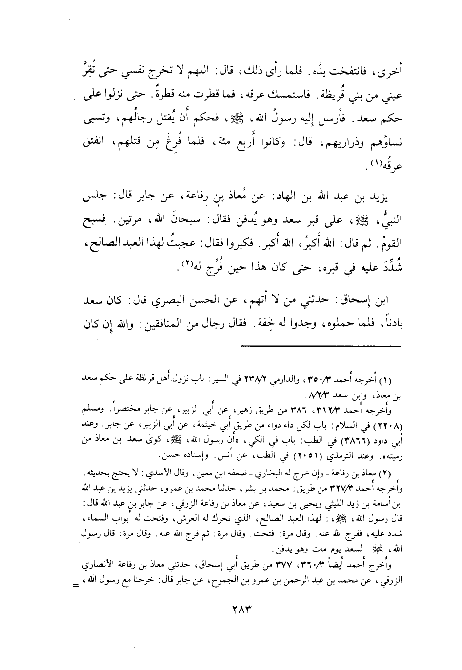 (1) أخرجه أحمد 3 / 350، والدارمي 2 / 238 في السير: باب نزول أهل قريظة على حكم سعد ابن معاذ، وابن سعد 3 / 2 / 8.