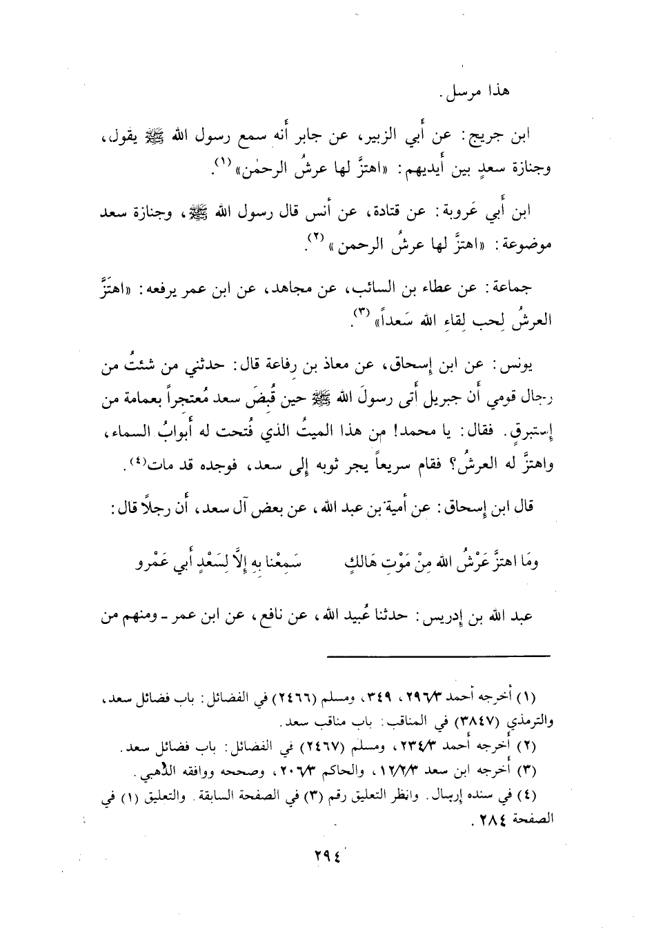 قَالَ رَسُوْلُ اللهِ -صَلَّى اللَّهُ عَلَيْهِ وَسَلَّمَ- وَجِنَازَةُ سَعْدٍ مَوْضُوْعَةٌ: (اهْتَزَّ لَهَا عَرْشُ الرَّحْمَنِ (2)) .