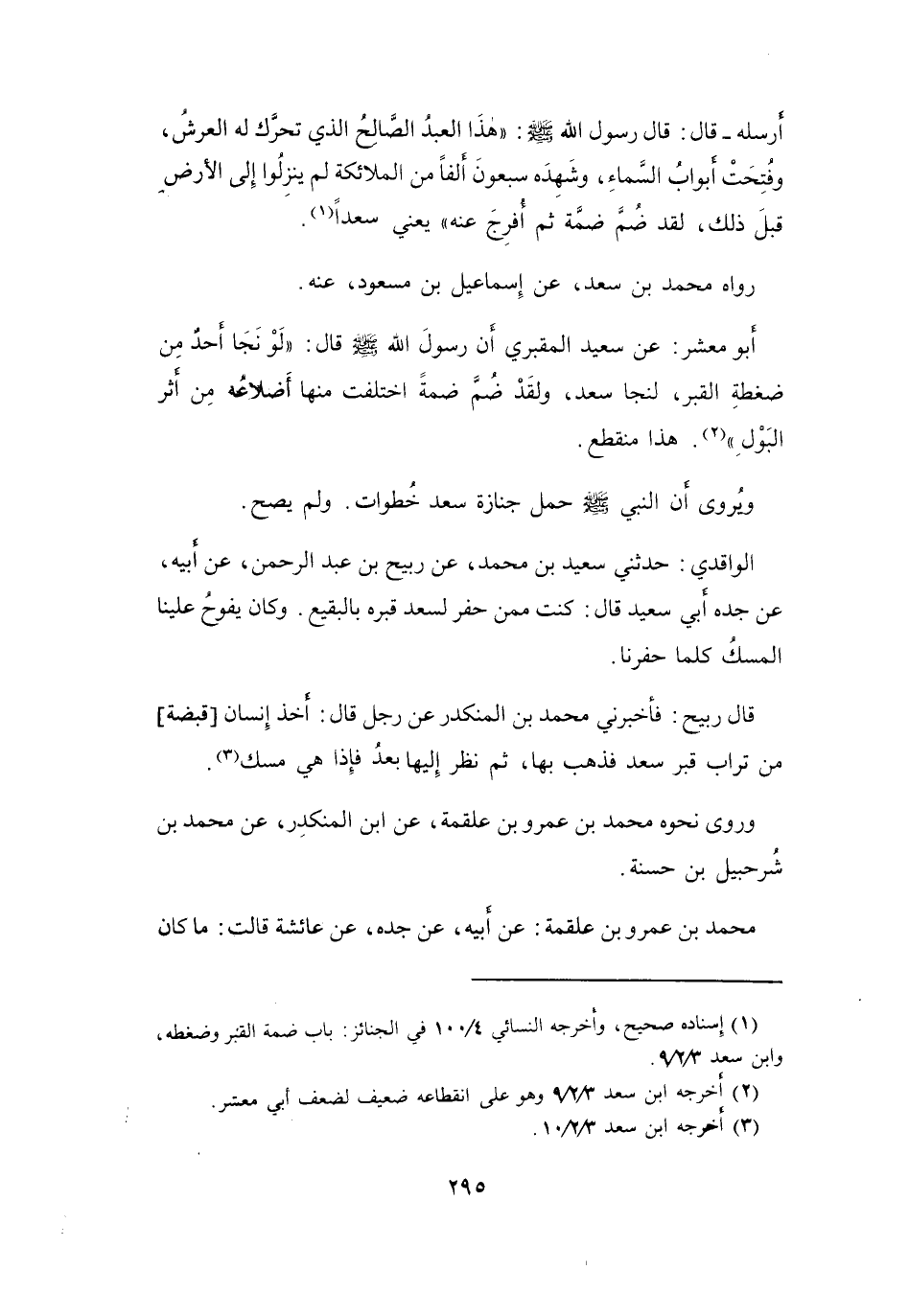 أَنَّ رَسُوْلَ اللهِ -صَلَّى اللَّهُ عَلَيْهِ وَسَلَّمَ- قَالَ: (لَوْ نَجَا أَحَدٌ مِنْ ضَغْطَةِ القَبْرِ لَنَجَا سَعْدٌ، وَلَقَدْ ضُمَّ ضَمَّةً اخْتَلَفَتْ مِنْهَا أَضْلاَعُهُ مِنْ أَثَرِ البَوْلِ (2)) . هَذَا مُنْقَطِعٌ.