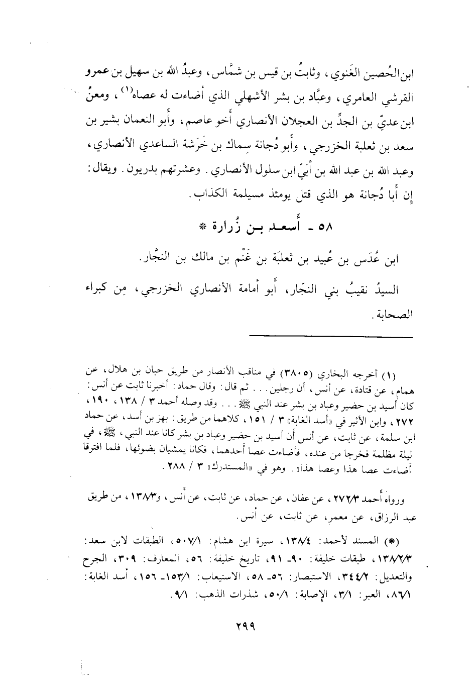 272، وابن الأثير في " أسد الغابة " 3 / 151، كلاهما من طريق: بهز بن أسد، عن حماد ابن سلمة، عن ثابت، عن أنس أن أسيد بن حضير وعباد بن بشر كانا عند النبي، صلى الله عليه وسلم، في ليلة مظلمة فخرجا من عنده، فأضاءت عصا أحدهما، فكانا يمشيان بضوئها، فلما افترقا أضاءت عصا هذا وعصا هذا ".