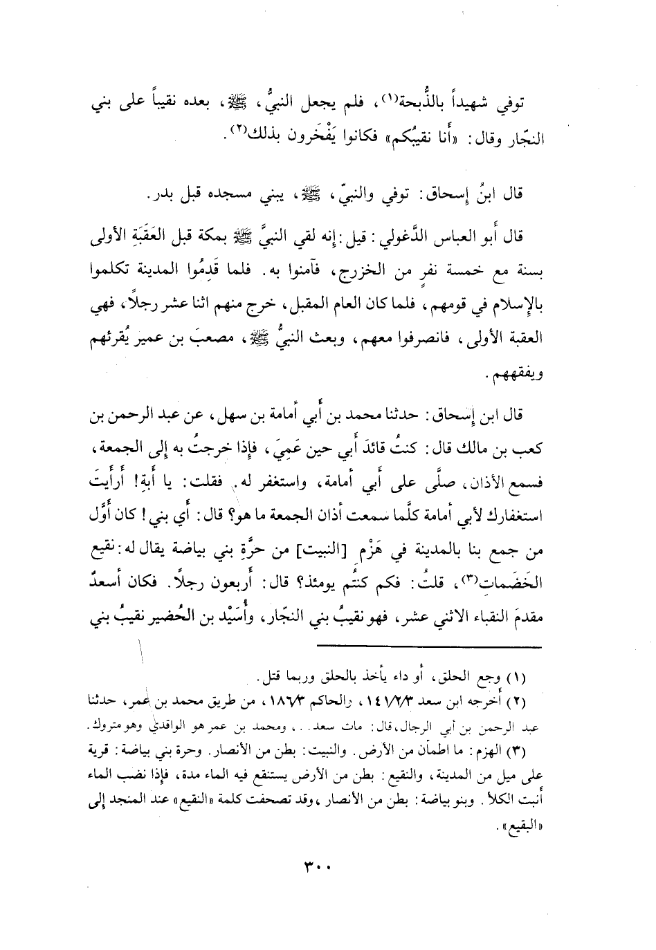 قَالَ: أَيْ بُنَيَّ! كَانَ أَوَّلُ مَنْ جَمَعَ بِنَا بِالمَدِيْنَةِ فِي هَزْمِ النّبِيْتِ، مِنْ حَرَّةِ بَنِي بَيَاضَةَ، يُقَالُ لَهُ: نَقِيْعُ الخَضَمَاتِ (3) .