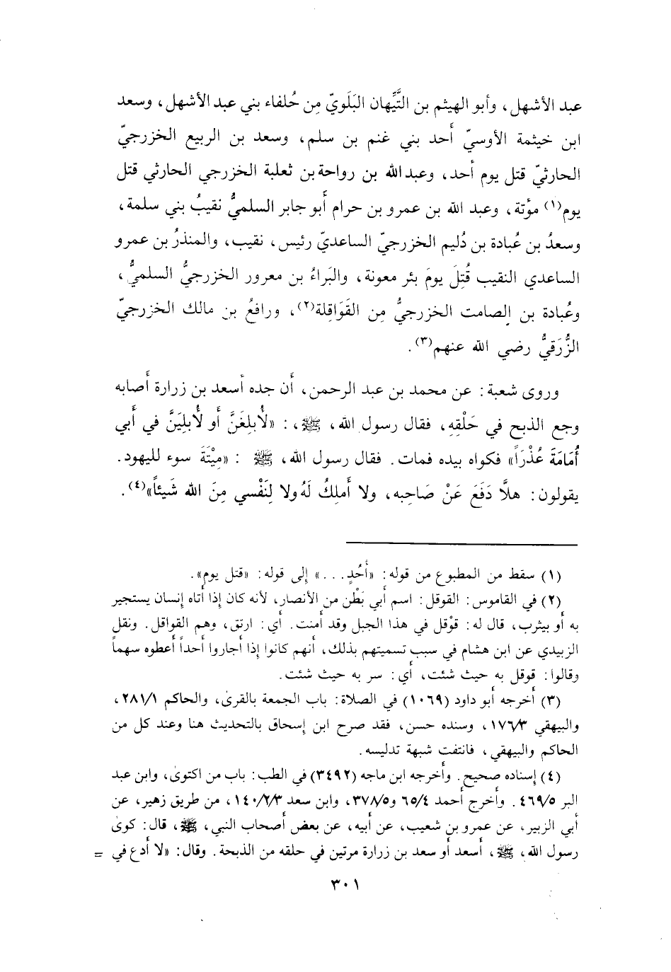 وأخرج أحمد 4 / 65 و5 / 378، وابن سعد 3 / 2 / 140، من طريق زهير، عن أبي الزبير، عن عمرو بن شعيب، عن أبيه، عن بعض أصحاب النبئ، صلى الله عليه وسلم، قال: كوى رسول الله، صلى الله عليه وسلم، أسعد أو سعد بن زرارة مرتين في حلقه من الذبحة.