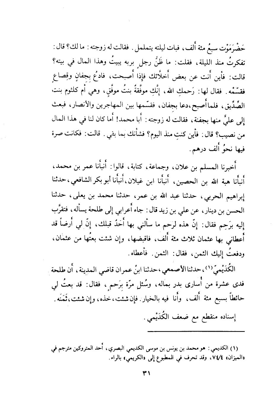 أَنَّ طَلْحَةَ فَدَى عَشْرَةً مِنْ أُسَارَى بَدْرٍ بِمَالِهِ، وَسُئِلَ مَرَّةً بِرَحِمٍ، فَقَالَ: