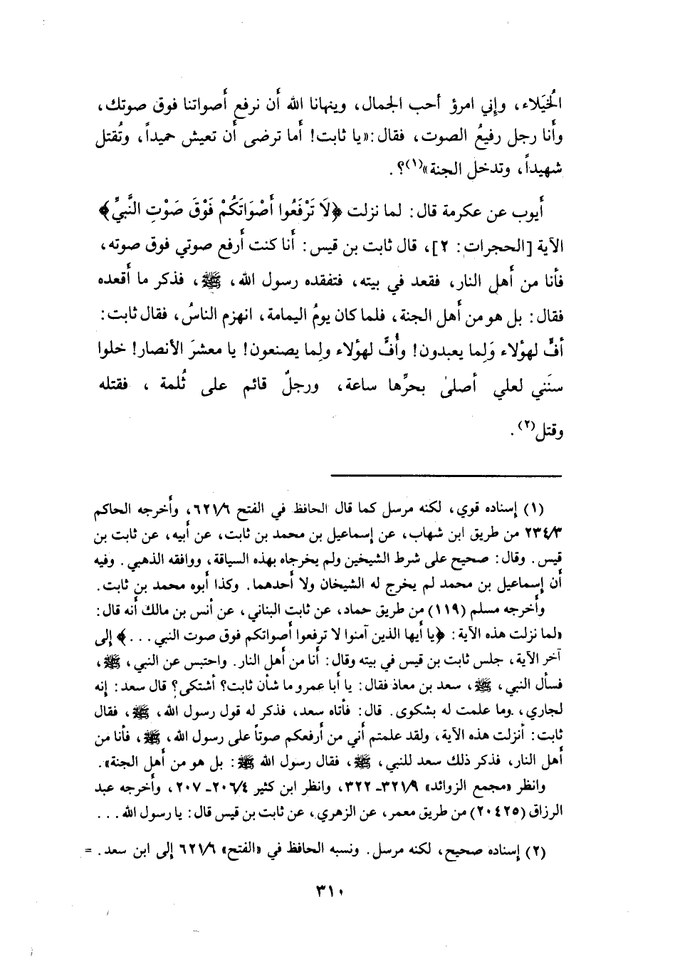 وأخرجه مسلم (119) من طريق حماد، عن ثابت البناني، عن أنس بن مالك أنه قال: " لما نزلت هذه الآية: (يا أيها الذين آمنوا لا ترفعوا أصواتكم فوق صوت النبي ... ) إلى آخر الآية، جلس ثابت بن قيس في بيته وقال: أنا من أهل النار.