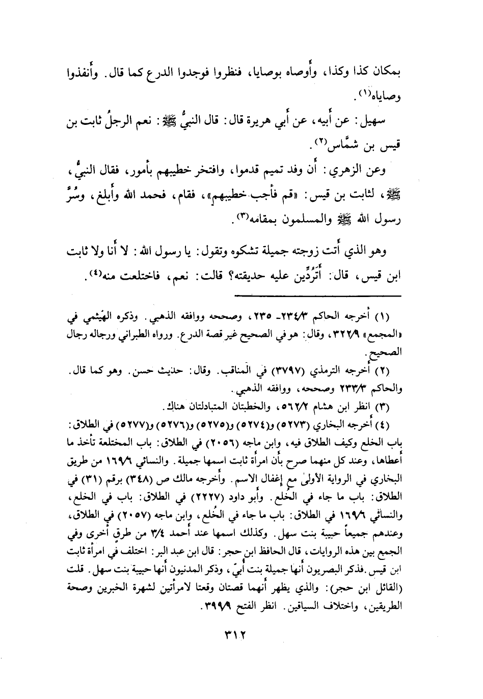 (4) أخرجه البخاري (5273) و (5274) و (5275) و (5276) و (5277) في الطلاق: باب الخلع وكيف الطلاق فيه، وابن ماجه (2056) في الطلاق: باب المختلعة تأخذ ما أعطاها، وعند كل منهما صرح بأن امرأة ثابت اسمها جميلة.