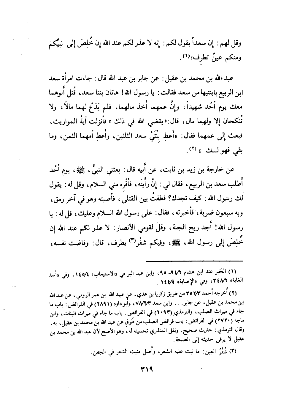 (2) أخرجه أحمد 3 / 352 من طريق زكريا بن عدي، عن عبيد الله بن عمر الرومي، عن عبد الله ابن محمد بن عقيل، عن جابر ... وابن سعد 3 / 2 / 78، وأبو داود (2891) في الفرائض: باب ما جاء ما ميراث الصلب، والترمذي (2093) في الفرائض: باب ما جاء في ميراث البنات، وابن ماجه (2720) في الفرائض: باب فرائض الصلب من طرق عن عبد الله بن محمد بن عقيل، به.