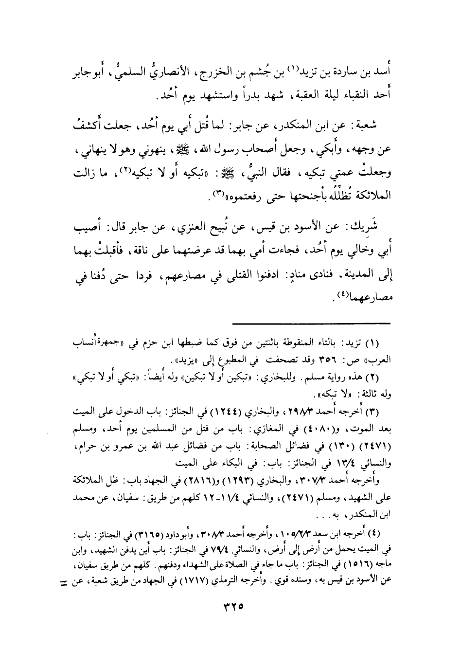 والنسائي 4 / 13 في الجنائز: باب: في البكاء على الميت وأخرجه أحمد 3 / 307، والبخاري (1293) و (2816) في الجهاد باب: ظل الملائكة على الشهيد، ومسلم (2471) ، والنسائي 4 / 11 - 12 كلهم من طريق: سفيان، عن محمد ابن المنكدر، به ...