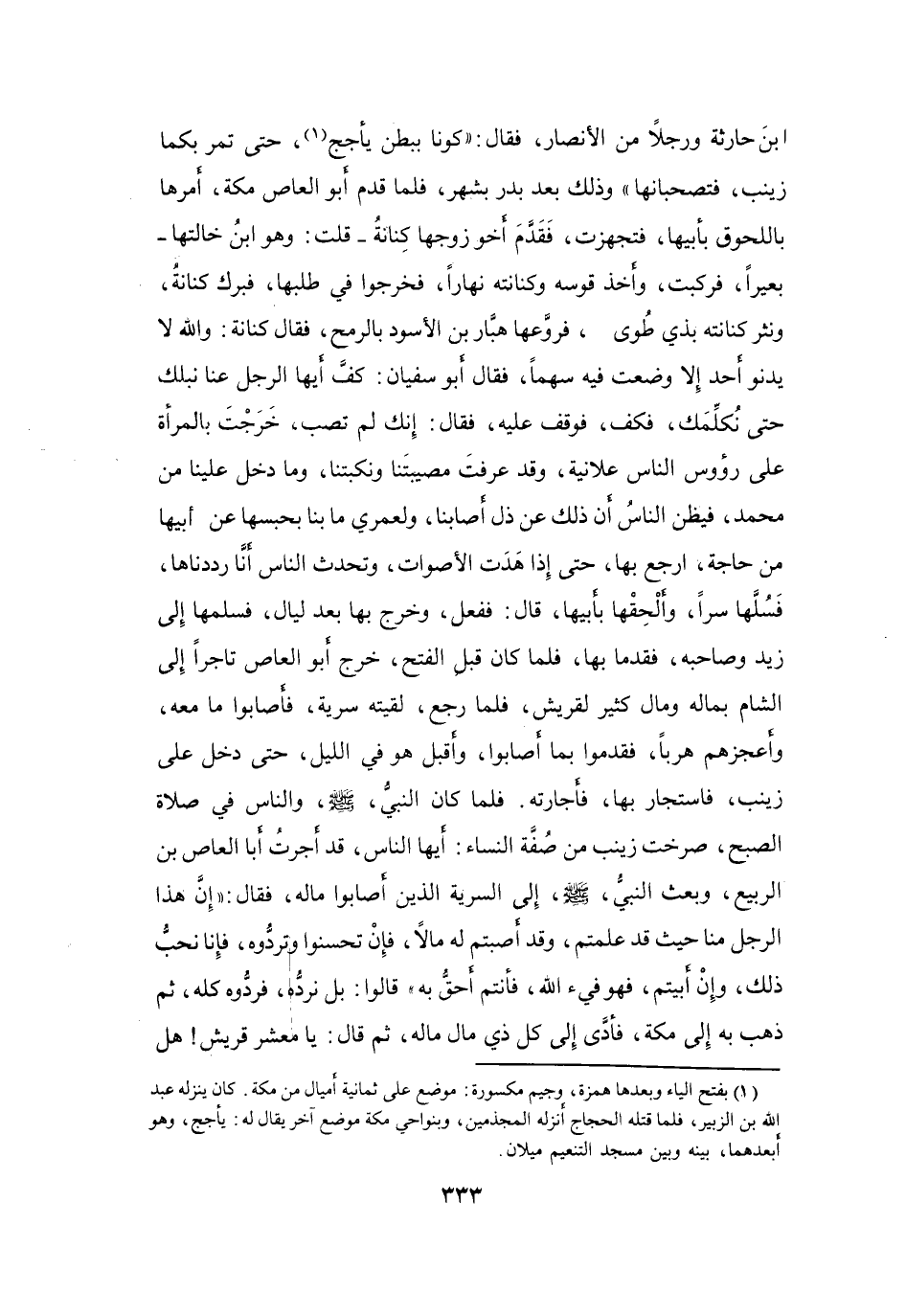 فَقَدَّمَ أَخُو زَوْجِهَا كِنَانَةُ - قُلْتُ: وَهُوَ ابْنُ خَالَتِهَا - بَعِيْراً، فَرَكِبَتْ، وَأَخَذَ قَوْسَهُ وَكِنَانَتَهُ نَهَاراً، فَخَرَجُوا فِي طَلَبِهَا، فَبَرَكَ كِنَانَةُ، وَنَثَرَ كِنَانَتَهُ بِذِي طُوَى، فَرَوَّعَهَا هَبَّارُ بنُ الأَسْوَدِ بِالرُّمْحِ.