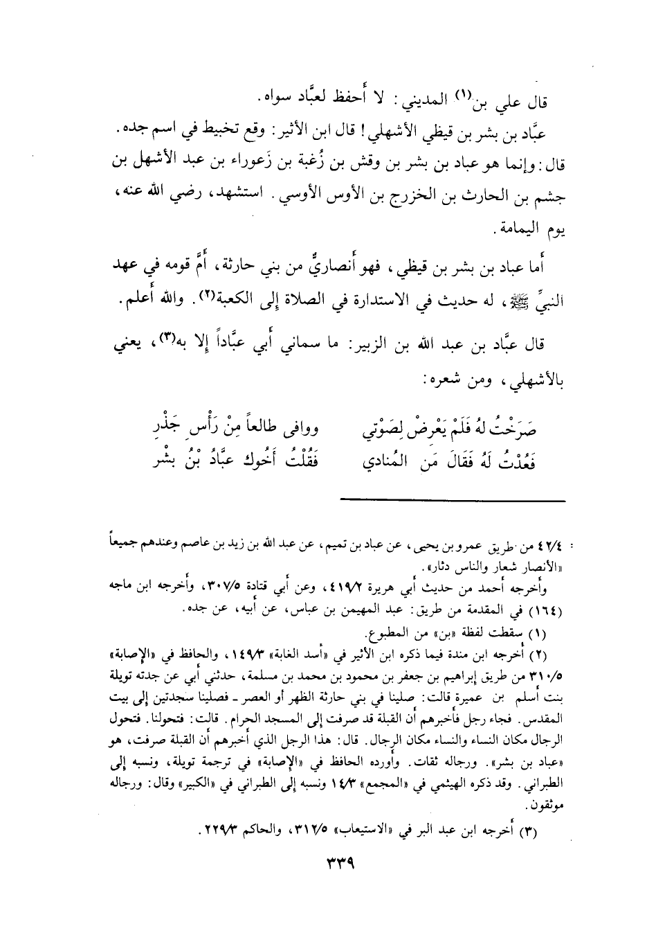 عَبَّادُ بنُ بِشْرِ بنِ قَيْظِيٍّ الأَشْهَلِيِّ! قَالَ ابْنُ الأَثِيْرِ: وَقَعَ تَخْبِيْطٌ فِي اسْمِ جَدِّهِ.