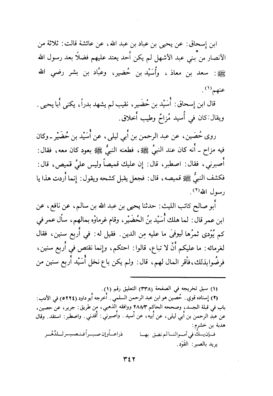 قَالَ ابْنُ إِسْحَاقَ: أُسَيْدُ بنُ حُضَيْرٍ نَقِيْبٌ لَمْ يَشْهَدْ بَدْراً، يُكْنَى: أَبَا يَحْيَى.