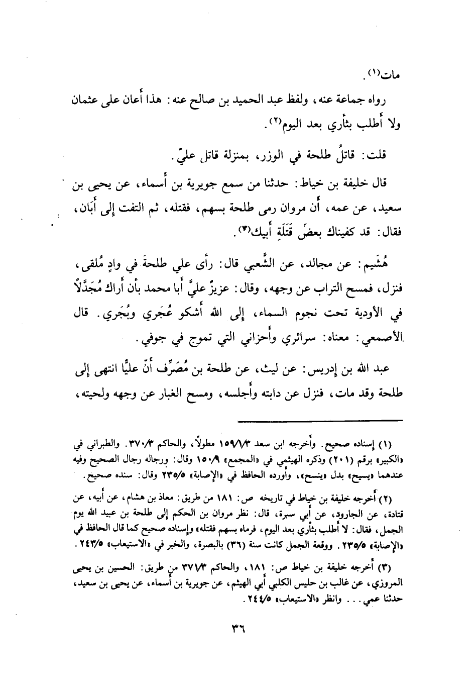 (2) أخرجه خليفة بن خياط في تاريخه ص: 181 من طريق: معاذ بن هشام، عن أبيه، عن قتادة، عن الجارود، عن أبي سيرة، قال: نظر مروان بن الحكم إلى طلحة بن عبيد الله يوم الجمل، فقال: لا أطلب بثأري بعد اليوم، فرماه بسهم فقتله " وإسناده صحيح كما قال الحافظ في " الإصابة " 5 / 235.