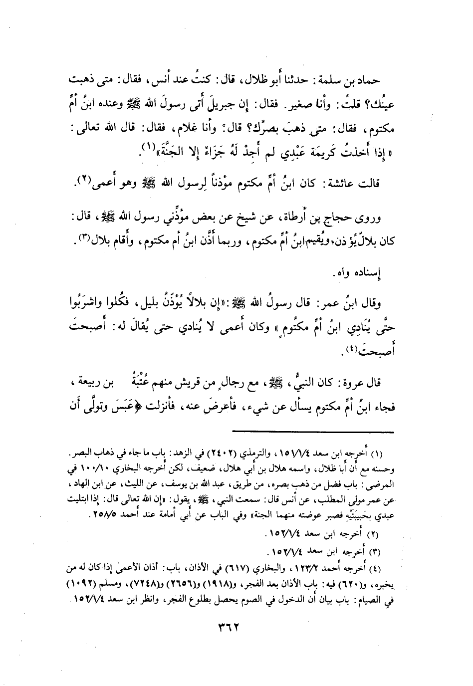 (4) أخرجه أحمد 2 / 123، والبخاري (617) في الاذان، باب: أذان الاعمى إذا كان له من يخبره، و (620) فيه: باب الاذان بعد الفجر، و (1918) و (2656) و (7248) ، ومسلم (1092) في الصيام: باب بيان أن الدخول في الصوم يحصل بطلوع الفجر، وانظر ابن سعد 4 / 1 / 152.