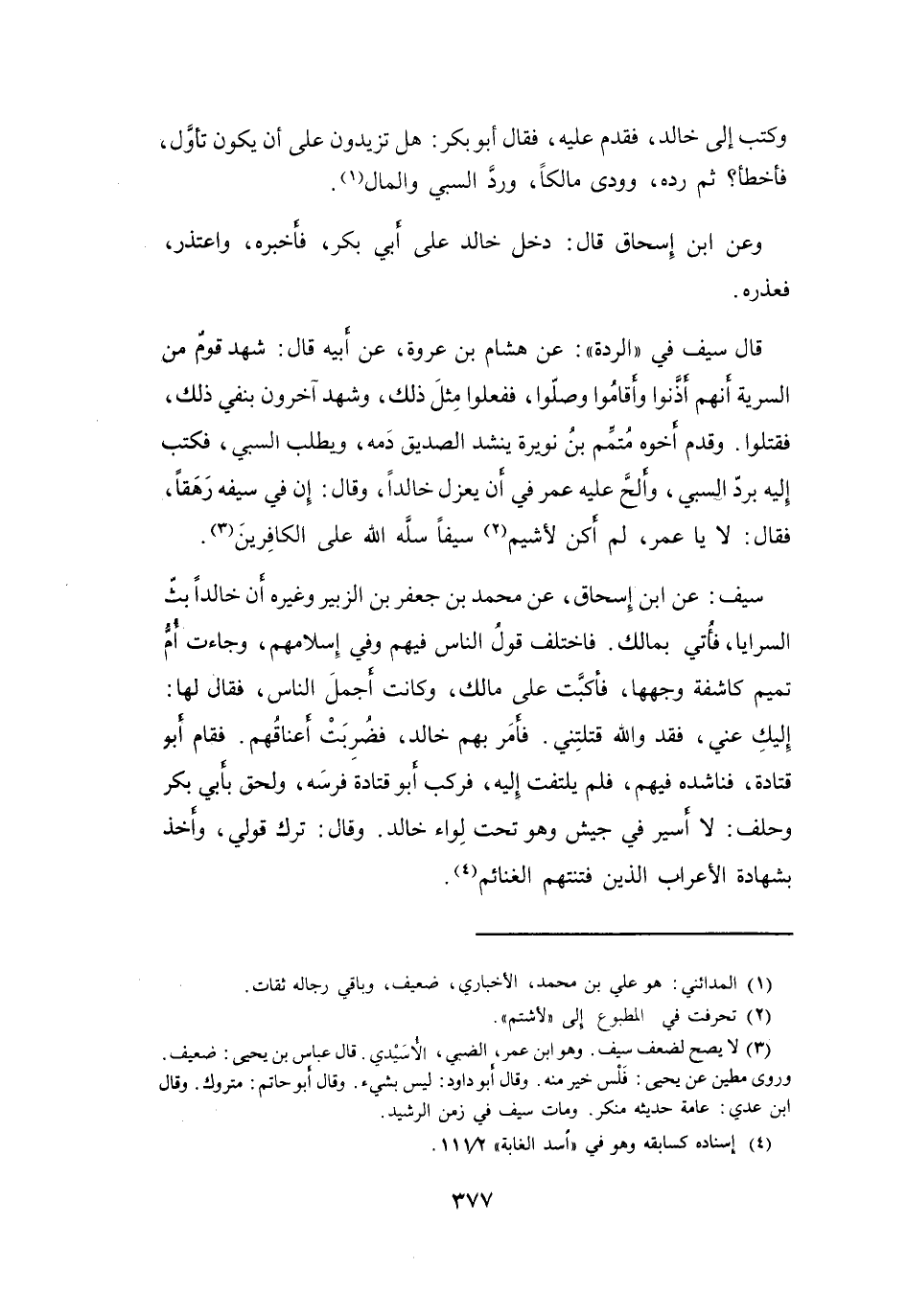 قَالَ سَيْفٌ فِي (الرِّدَّةِ) : عَنْ هِشَامِ بنِ عُرْوَةَ، عَنْ أَبِيْهِ، قَالَ: