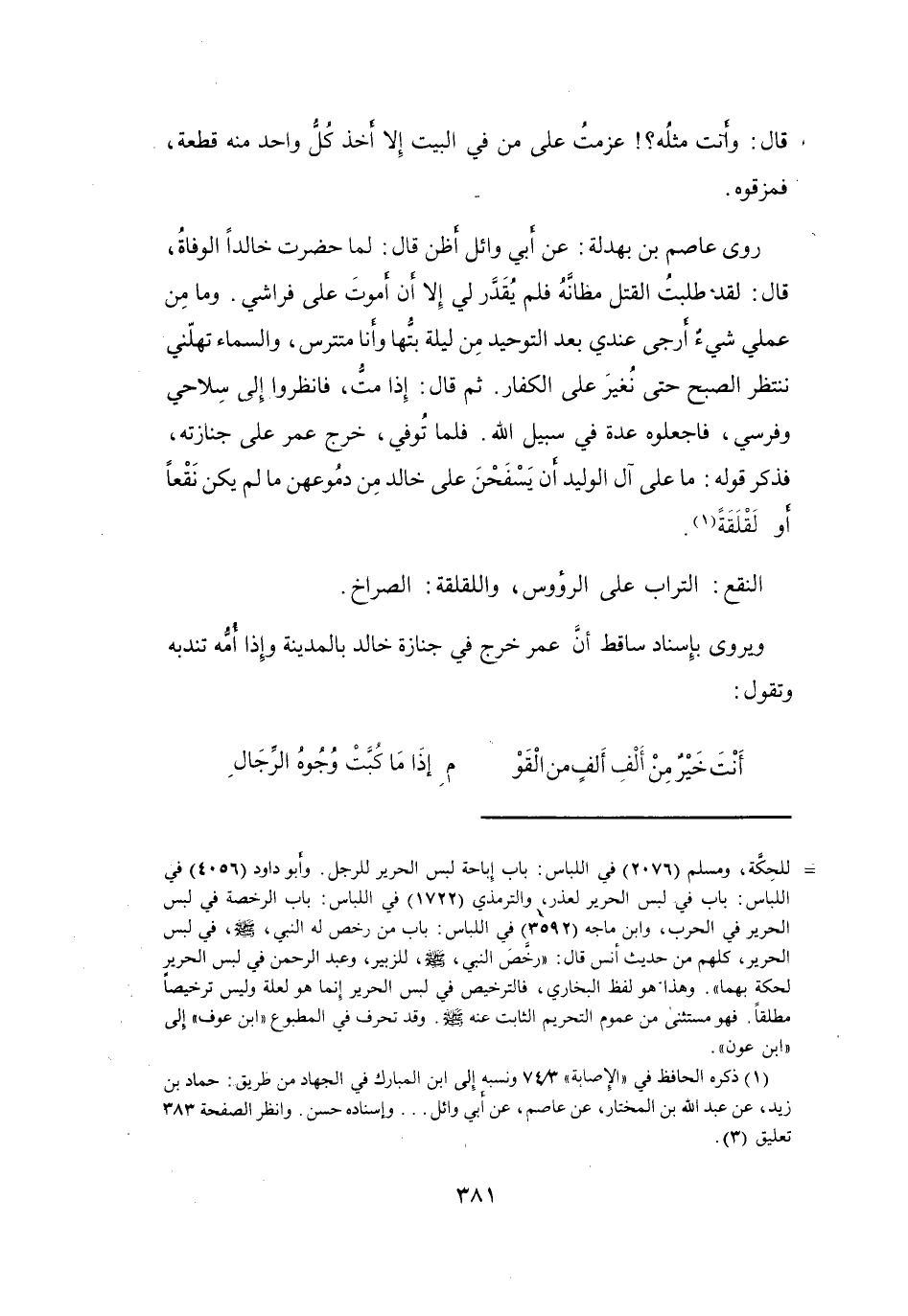 مَا عَلَى آلِ الوَلِيْدِ أَنْ يَسْفَحْنَ عَلَى خَالِدٍ مِنْ دُمُوْعِهِنَّ، مَا لَمْ يَكُنْ نَقْعاً أَوْ لَقْلَقَةً (1) .