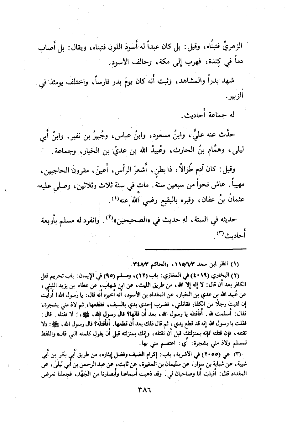 (2) البخاري (4019) في المغازي: باب (12) ، ومسلم (95) في الايمان: باب تحريم قتل الكافر بعد أن قال: لا إله إلا الله، من طريق الليث، عن ابن شهاب، عن عطاء بن يزيد الليثي، عن عبيد الله بن عدي بن الخيار، عن المقداد بن الأسود، أنه أخبره أنه قال: يا رسول الله! أرأيت إن لقيت رجلا من الكفار فقاتلني، فضرب إحدى يدي بالسيف، فقطعها، ثم لاذ مني بشجرة، فقال: أسلمت لله.