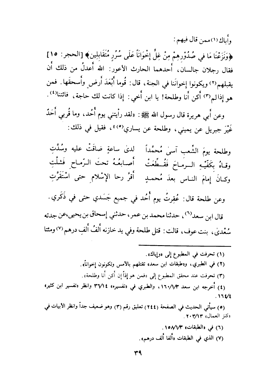 (3) تحرفت عند محقق المطبوع إلى " فمن هو إذا إن أكن أنا وطلحة ".
