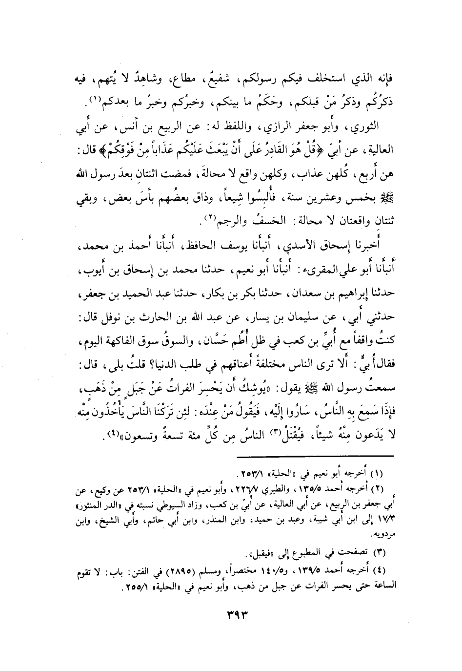 (4) أخرجه أحمد 5 / 139، و5 / 140 مختصرا، ومسلم (2895) في الفتن: باب: لا تقوم الساعة حتى يحسر الفرات عن جبل من ذهب، وأبو نعيم في " الحلية " 1 / 255.