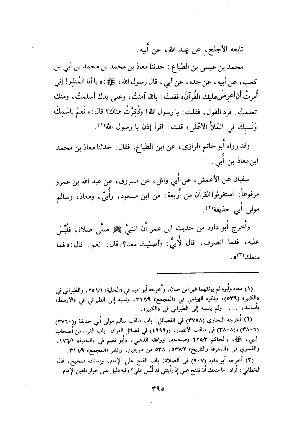 مُحَمَّدُ بنُ عِيْسَى بنِ الطَّبَّاعِ: حَدَّثَنَا مُعَاذُ بنُ مُحَمَّدِ بنِ مُحَمَّدِ بنِ أُبَيِّ بنِ كَعْبٍ، عَنْ أَبِيْهِ، عَنْ جَدِّهِ، عَنْ أُبَيٍّ:
