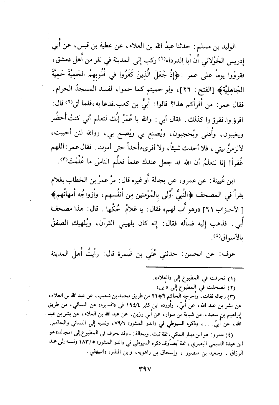 أَنَّ أَبَا الدَّرْدَاءِ (1) رَكِبَ إِلَى المَدِيْنَةِ فِي نَفَرٍ مِنْ أَهْلِ دِمَشْقَ، فَقَرَؤُوا يَوْماً عَلَى عُمَرَ: {إِذْ جَعَلَ الَّذِيْنَ كَفَرُوا فِي قُلُوْبِهِمُ الحَمِيَّةَ حَمِيَّةَ الجَاهِلِيَّةِ} [الفَتْحُ: 26] ، وَلَوْ حَمِيْتُمْ كَمَا حَمَوْا لَفَسَدَ المَسْجِدُ الحَرَامُ.