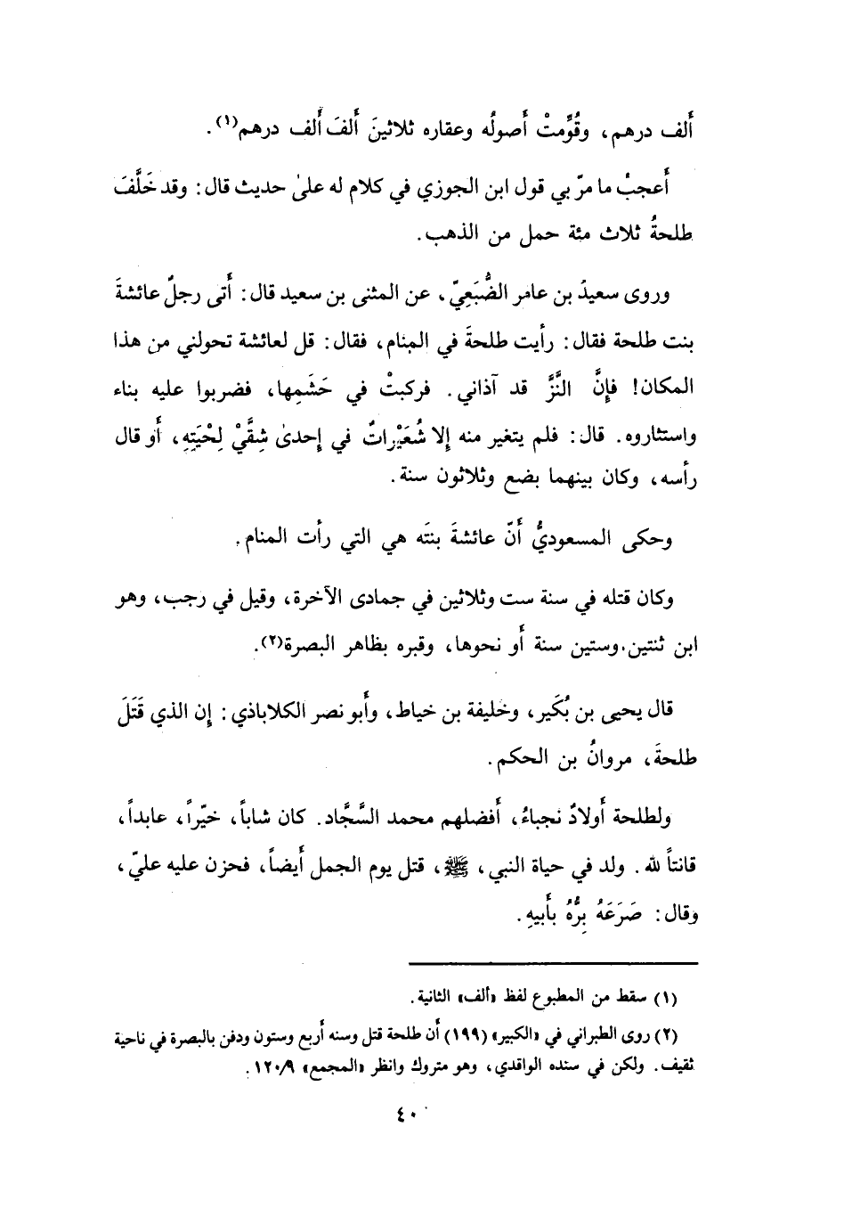 (2) روى الطبراني في " الكبير " (199) أن طلحة قتل وسنه أربع وستون ودفن بالبصرة في ناحية ثقيف.