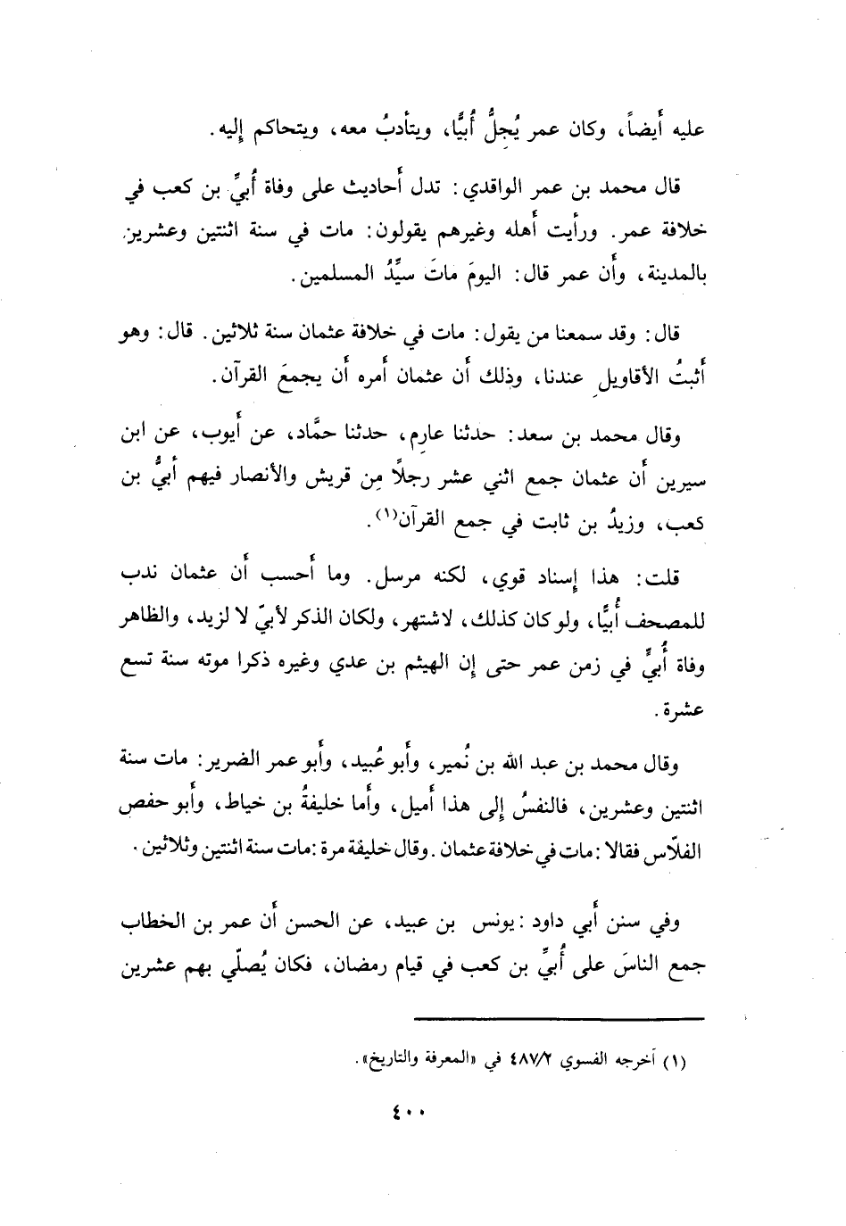 قُلْتُ: هَذَا إِسْنَادٌ قَوِيٌّ، لَكِنَّهُ مُرْسَلٌ، وَمَا أَحْسِبُ أَنَّ عُثْمَانَ نَدَبَ لِلْمُصْحَفِ أُبَيّاً، وَلَوْ كَانَ كَذَلِكَ لاَشْتَهَرَ، وَلَكَانَ الذِّكْرُ لأُبِيٍّ لاَ لِزَيْدٍ، وَالظَّاهِرُ وَفَاةُ أُبَيٍّ فِي زَمَنِ عُمَرَ، حَتَّى إِنَّ الهَيْثَمَ بنَ عَدِيٍّ وَغَيْرَهُ ذَكَرَا مَوْتَهُ سَنَةَ تِسْعَ عَشْرَةَ.