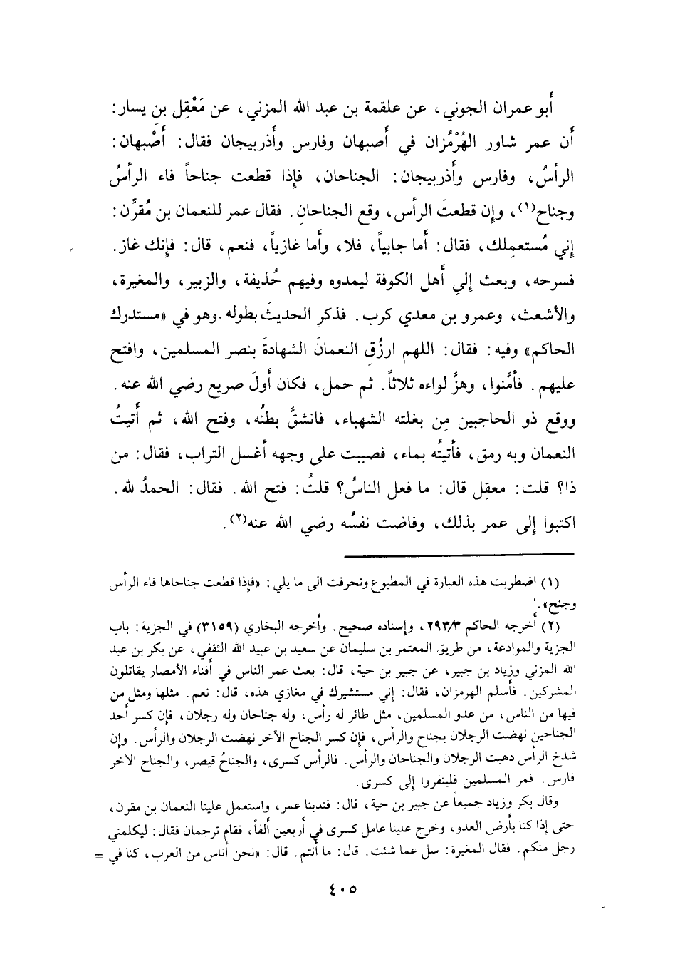 وأخرجه البخاري (3159) في الجزية: باب الجزية والموادعة، من طريق المعتمر بن سليمان عن سعيد بن عبيد الله الثقفي، عن بكر بن عبد الله المزني وزياد بن جبير، عن جبير بن حية، قال: بعث عمر الناس في أفناء الأمصار يقاتلون المشركين.