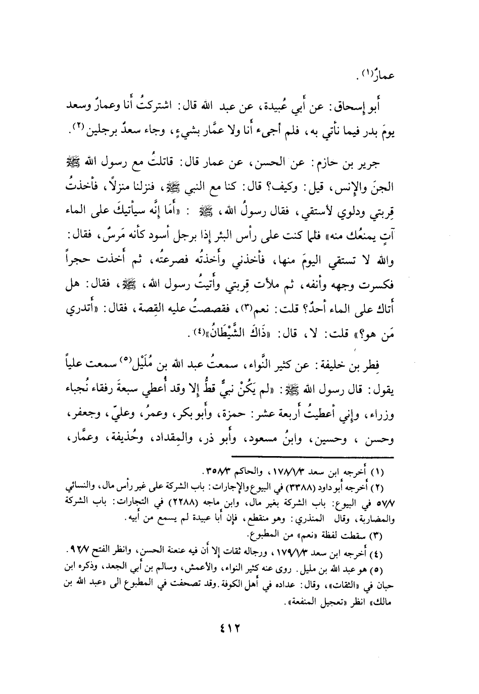 اشْتَرَكْتُ أَنَا وَعَمَّارٌ وَسَعْدٌ يَوْمَ بَدْرٍ فِيْمَا نَأْتِي بِهِ، فَلَمْ أَجِئْ أَنَا وَلاَ عَمَّارٌ بِشَيْءٍ، وَجَاءَ سَعْدٌ بِرَجُلَيْنِ (2) .