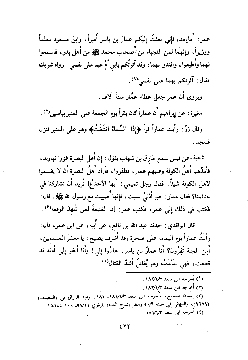 عُمَرَ: أَمَّا بَعْدُ، فَإِنِّي بَعَثْتُ إِلَيْكُم عَمَّارَ بنَ يَاسِرٍ أَمِيْراً، وَابْنَ مَسْعُوْدٍ مُعَلِّماً وَوَزِيْراً، وَإِنَّهُمَا لَمِنَ النُّجَبَاءِ مِنْ أَصْحَابِ مُحَمَّدٍ -صَلَّى اللَّهُ عَلَيْهِ وَسَلَّمَ- مِنْ أَهْلِ بَدْرٍ، فَاسْمَعُوا لَهُمَا، وَأَطِيْعُوا، وَاقْتَدُوا بِهِمَا، وَقَدْ آثَرْتُكُم بِابْنِ أُمِّ عَبْدٍ عَلَى نَفْسِي.