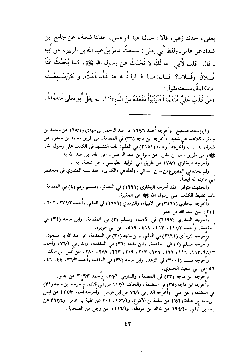 حَدَّثَنَا عَبْدُ الرَّحْمَنِ، حَدَّثَنَا شُعْبَةُ، عَنْ جَامِعِ بنِ شَدَّادٍ، عَنْ عَامِرٍ، وَلفْظُ أَبِي يَعْلَى: سَمِعْتُ عَامِرَ بنَ عَبْدِ اللهِ بنِ الزُّبَيْرِ، عَنْ أَبِيْهِ، قَالَ: قُلْتُ لأَبِي: مَا لَكَ لاَ تُحَدِّثُ عَنْ رَسُوْلِ اللهِ -صَلَّى اللَّهُ عَلَيْهِ وَسَلَّمَ- كَمَا يُحَدِّثُ عَنْهُ فُلاَنٌ وَفُلاَنٌ؟