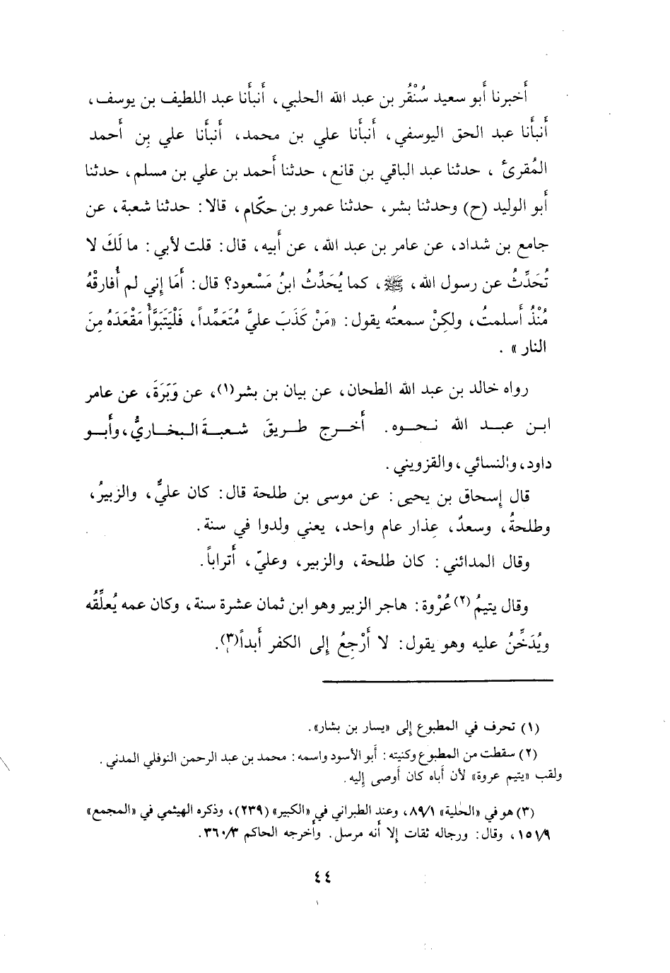 أَخْبَرَنَا أَبُو سَعِيْدٍ سُنْقُرُ بنُ عَبْدِ اللهِ الحَلَبِيُّ، أَنْبَأَنَا عَبْدُ اللَّطِيْفِ بنُ يُوْسُفَ، أَنْبَأَنَا عَبْدُ الحَقِّ اليُوْسُفِيُّ، أَنْبَأَنَا عَلِيُّ بنُ مُحَمَّدٍ، أَنْبَأَنَا عَلِيُّ بنُ أَحْمَدَ المُقْرِئُ، حَدَّثَنَا عَبْدُ البَاقِي بنُ قَانِعٍ، حَدَّثَنَا أَحْمَدُ بنُ عَلِيِّ بنِ مُسْلِمٍ، حَدَّثَنَا أَبُو الوَلِيْدِ (ح) .