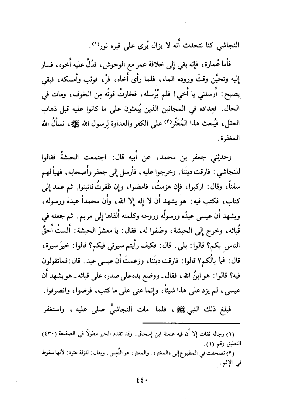 النَّجَاشِيُّ كُنَّا نَتَحَدَّثُ أَنَّهُ لاَ يَزَالُ يُرَى عَلَى قَبْرِهِ نُوْرٌ (1) .
