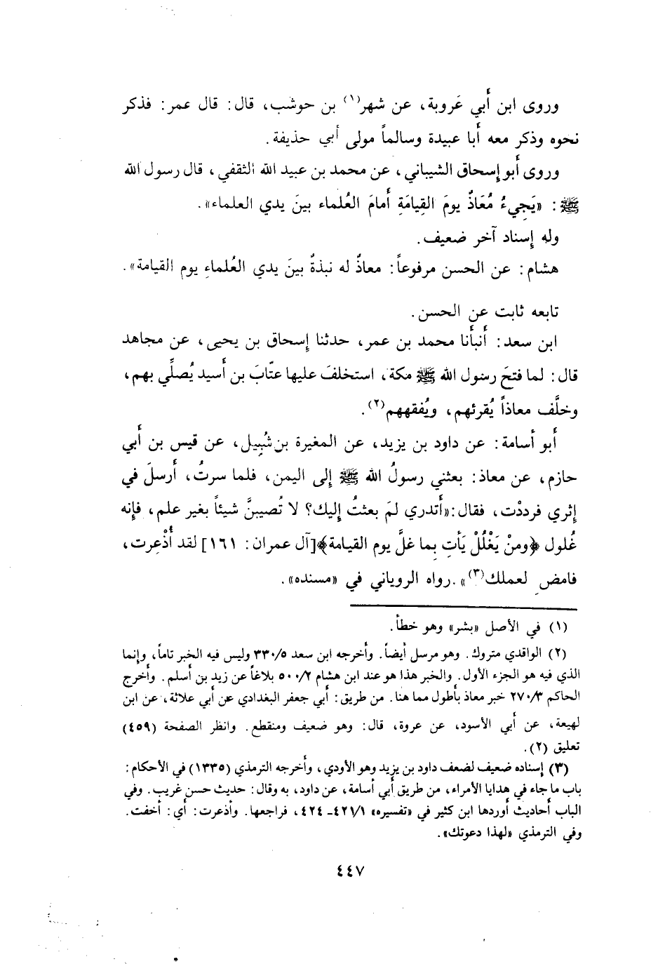 هِشَامٌ: عَنِ الحَسَنِ مَرْفُوْعاً: (مُعَاذٌ لَهُ نَبْذَةٌ بَيْنَ يَدَي العُلَمَاءِ يَوْمَ القِيَامَةِ) .