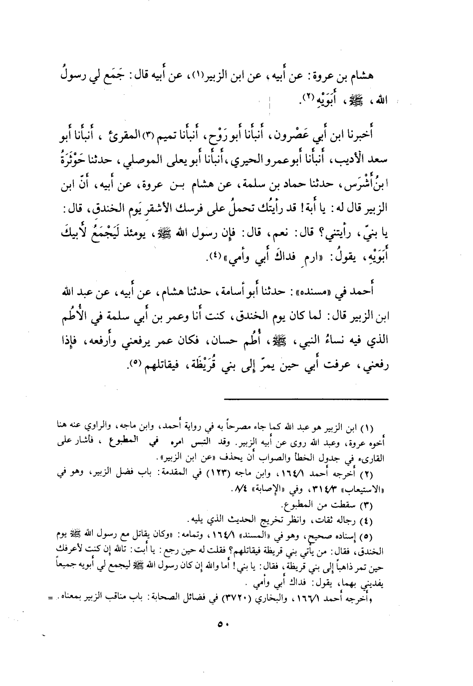 (5) إسناده صحيح، وهو في " المسند " 1 / 164، وتمامه: " وكان يقاتل مع رسول الله صلى الله عليه وسلم يوم الخندق، فقال: من يأتي بني قريظة فيقاتلهم؟ فقلت له حين رجع: يا أبت: تالله إن كنت لاعرفك حين تمر ذاهبا إلى بني قريظة، فقال: يا بني! أما والله إن كان رسول الله صلى الله عليه وسلم ليجمع لي أبويه جميعا يفديني بهما، يقول: فداك أبي وأمي.