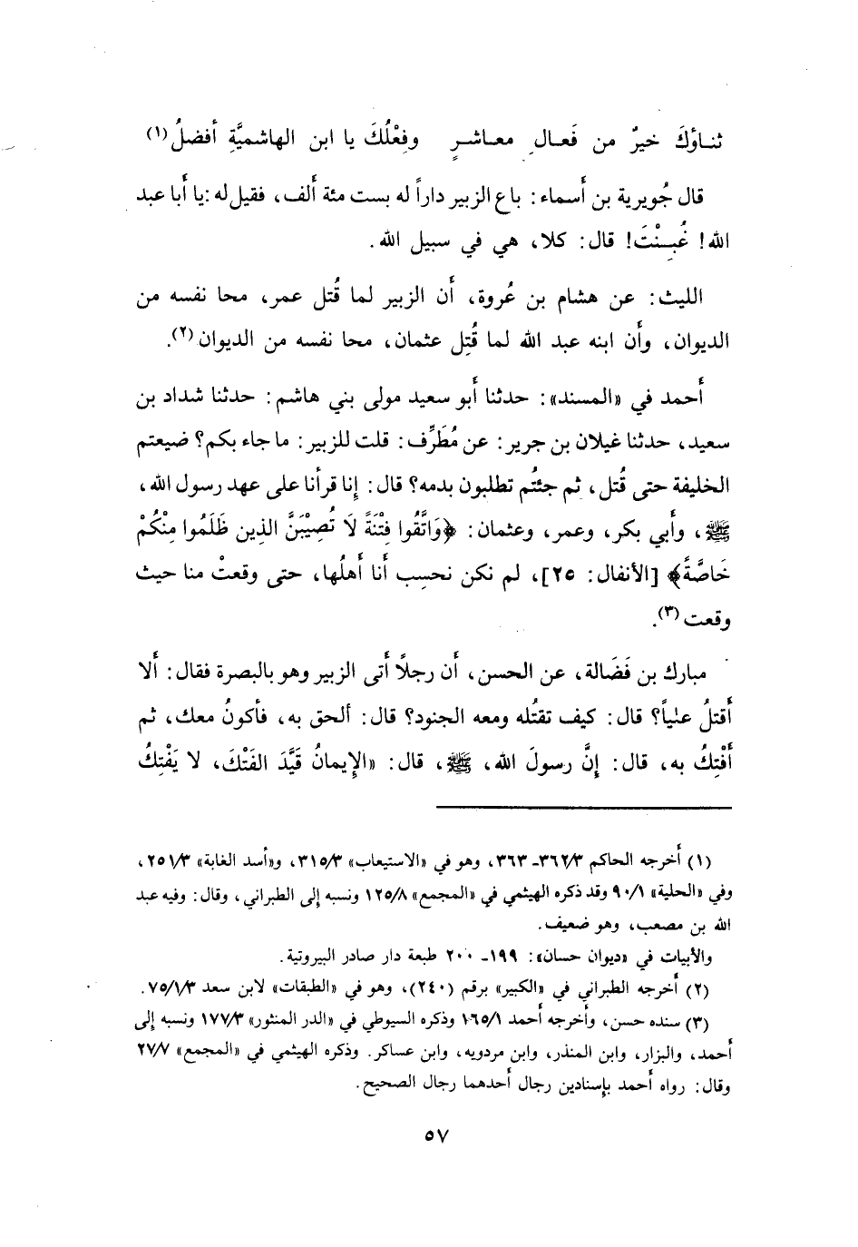 أَحْمَدُ فِي (المُسْنَدِ) : حَدَّثَنَا أَبُو سَعِيْدٍ مَوْلَى بَنِي هَاشِمٍ، حَدَّثَنَا شَدَّادُ بنُ سَعِيْدٍ، حَدَّثَنَا غَيْلاَنُ بنُ جَرِيْرٍ، عَنْ مُطَرِّفٍ، قُلْتُ لِلزُّبَيْرِ: مَا جَاءَ بِكُمْ، ضَيَّعْتُمُ الخَلِيْفَةَ حَتَّى قُتِلَ، ثُمَّ جِئْتُمْ تَطْلُبُوْنَ بِدَمِهِ؟