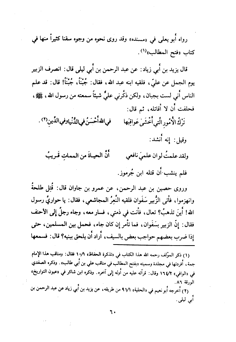 قَالَ: قُتِلَ طَلْحَةُ وَانْهَزَمُوا، فَأَتَى الزُّبَيْرُ سَفَوَانَ، فَلَقِيَهُ النَّعِرُ المُجَاشِعِيُّ، فَقَالَ:
