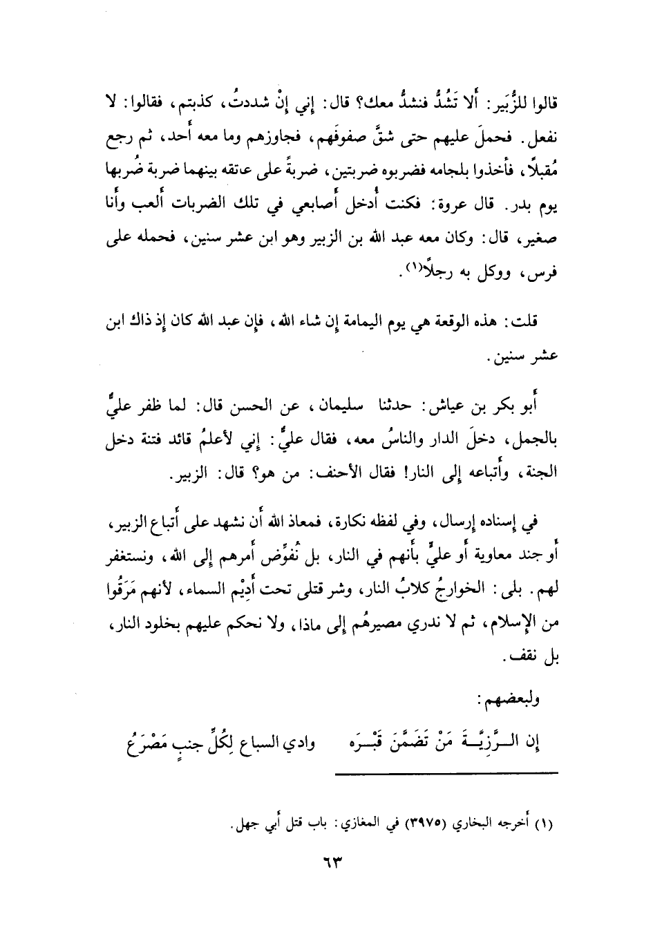 قَالُوا لِلزُّبَيْرِ: أَلاَ تَشُدُّ فَنَشُدُّ مَعَكَ؟
