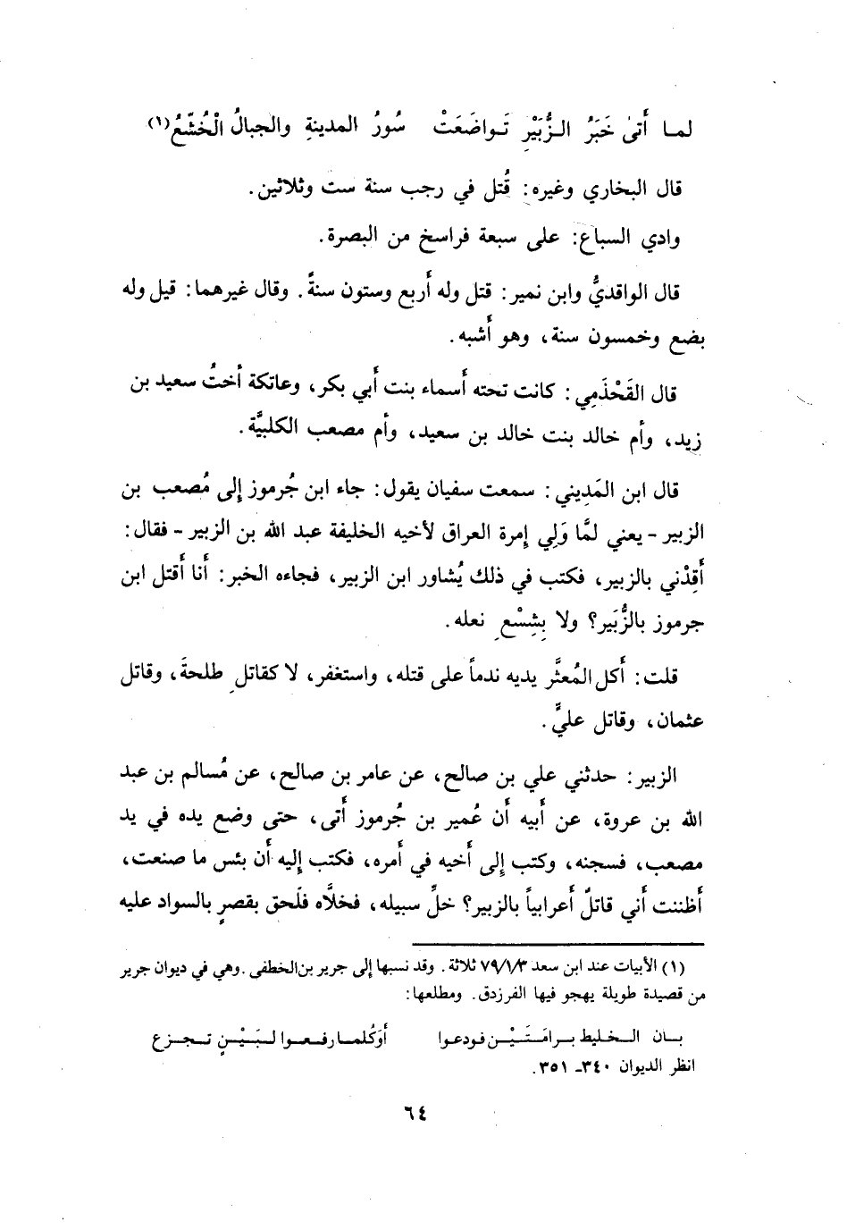 لَمَّا أَتَى خَبَرُ الزُّبَيْرِ تَوَاضَعَتْ ... سُوْرُ المَدِيْنَةِ وَالجِبَالُ الخُشَّعُ (1)