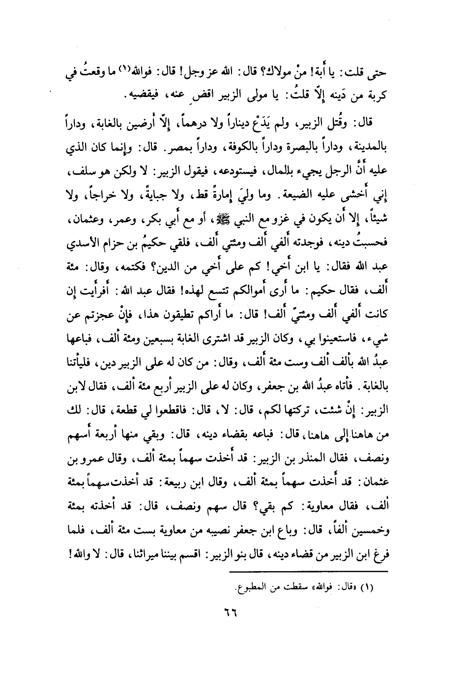 قَالَ: فَوَاللهِ (1) مَا وَقَعْتُ فِي كُرْبَةٍ مِنْ دَيْنِهِ، إِلاَّ قُلْتُ: يَا مَوْلَى الزُّبَيْرِ اقْضِ عَنْهُ، فَيَقْضِيَهُ.